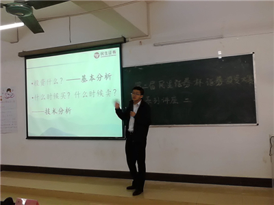 本次讲座在同学们热情高涨的鼓掌声中拉开了序幕,首先,莫伟平老师上台与同学们分享了选股基本分析方法,他告诉我们,学习证券投资,就要关注宏观经济形势和行业发展前景,才能把握市场的动态,在证券投资的茫茫大海中稳操胜券。随后,他又细讲了各个选股方法,让同学们对选股技巧有了更深的认知,同时,他建议我们选股不要仅仅着眼于它的跌涨,要在对它进行深刻了解与分析之后才能断定其优劣,并决定是否购买。盲目投资只会带来损失,莫先生建议,要参与投资,就要了解一定的投资知识。他介绍了《股市趋势技术分析》这本书给在座的同学们,希望有意愿加入投资大军的人都来学习一下。