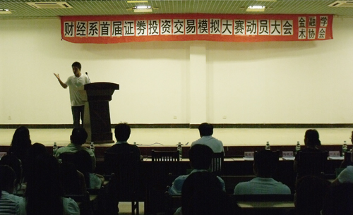 2009年10月13日在六栋学术报告大厅进行了首届证券投资模拟交易大赛动员大会。本次的证券投资模拟交易大赛共有1043人参加,横跨系部财管、金融、经济、会计几个专业。