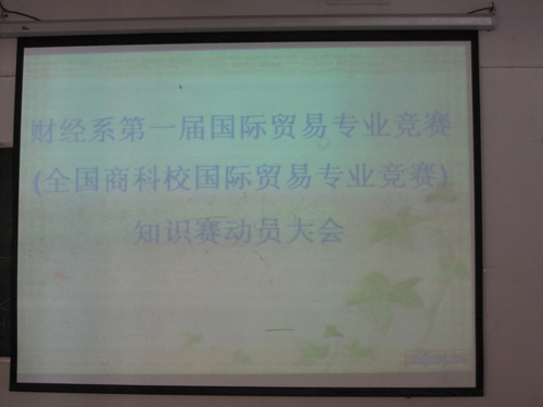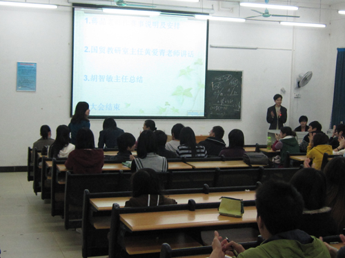 12月1日晚上9:20~10:30,财经系国际贸易专业知识竞赛(全国第四届国际贸易专业知识竞赛)动员大会在6#103顺利召开。财经系副主任胡智敏老师、国贸教研室主任黄爱青老师、本次大赛的指导老师蒋晶老师和王红平老师及报名参赛的170余名学生参加了本次动员大会。