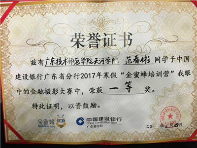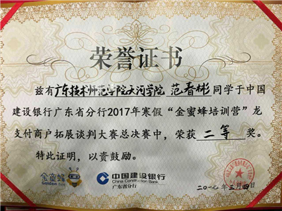 3月4日下午,中国建设银行广东省分行2017年寒假“金蜜蜂培训营”结业典礼暨“龙支付”商户拓展谈判大赛总决赛在省分行大礼堂隆重召开,我校财经学院范春彬同学荣获谈判大赛亚军和“我眼中的金融”摄影比赛一等奖。