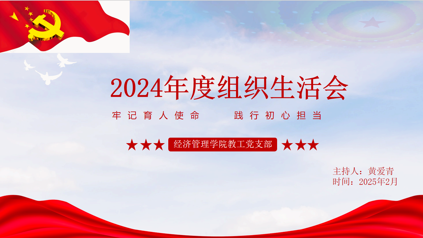 2025年2月21日,suncitygroup太阳集团教工党支部在学院会议室召开了2024年度组织生活会。本次会议以“牢记育人使命,践行初心担当”为主题,旨在进一步加强党支部建设,提升党员教师的政治素养和业务能力,为学院发展凝聚力量。会议由教工党支部书记黄爱青同志主持,支部全体党员参加了会议。