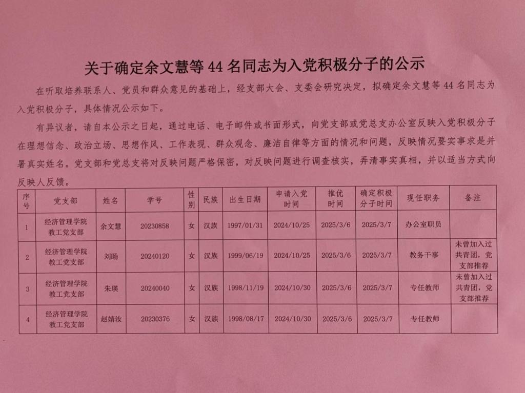 在听取培养联系人、党员和群众意见的基础上,经支部大会、支委会研究决定,拟确定余文慧等44名同志为入党积极分子,具体情况公示如下。