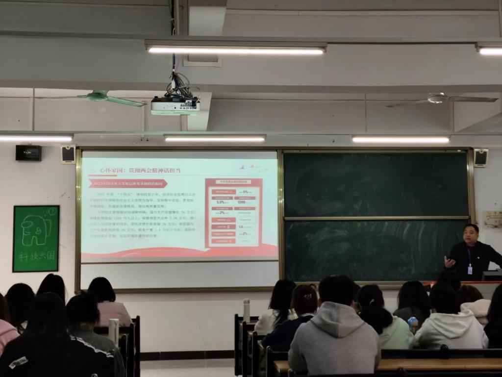 课上,彭康煜书记围绕“心怀家国:贯彻两会精神话担当”展开讲述,他强调,全国两会是国家政治生活中的大事,关乎国计民生,同学们应密切关注两会动态,深入学习两会精神,将个人发展与国家需求紧密结合。从乡村振兴战略到科技创新驱动,从民生保障完善到生态环境保护,提醒同学们要深刻认识到自身肩负的时代责任,积极投身社会实践,以实际行动为国家发展贡献力量。