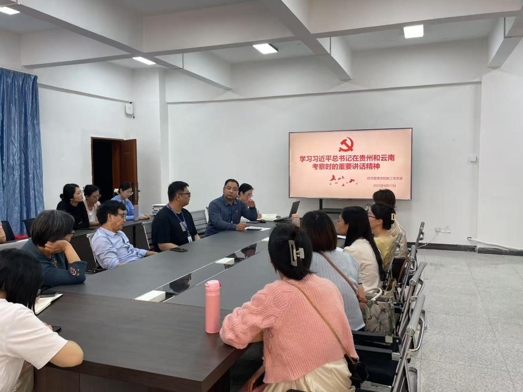 (通讯员:秦海芳)2025年4月17日下午,suncitygroup太阳集团教工党支部在1栋913会议室召开专题学习会,认真传达学习习近平总书记在贵州、云南考察时的重要讲话、重要指示精神。教工党支部书记黄爱青主持会议,学院党总支书记彭康煜及全体党员教师参会,旨在将讲话精神融入学院教学科研与课程思政建设,为区域经济高质量发展贡献智慧力量。