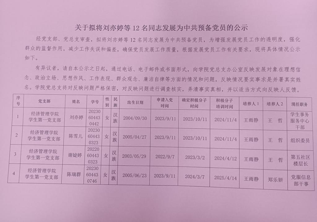 经党支部、党总支审查,拟将刘亦婷等12名同志发展为中共预备党员,为增强发展党员工作的透明度,强化群众的监督作用,减少工作失误和偏差,确保党员发展工作质量,根据发展党员工作有关要求,现将具体情况公示如下。