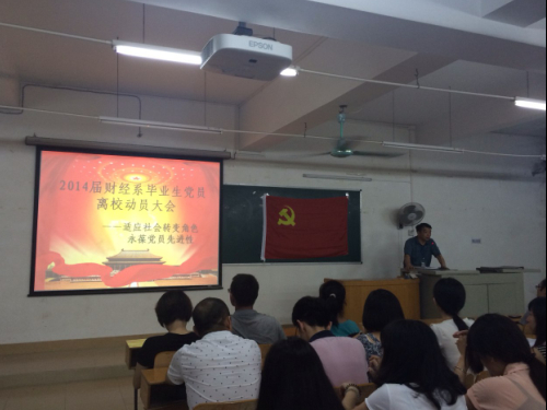 为了增强毕业生党员的党性修养,提高毕业生党员的思想觉悟,坚定毕业生党员的理想信念,做好“适应社会转变角色,永葆党员先进性”,发挥党员在毕业生离校过程中的先锋模范作用,2014年6月27日晚,我系为即将走上社会的2014届毕业生党员举行了毕业生党员离校动员大会。出席会议的有我系党总支书记李伟民、办公室主任刘亮主任,各学生支部书记,以及我系2014届全体毕业生党员。