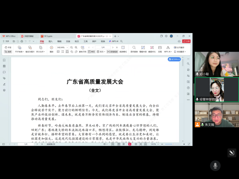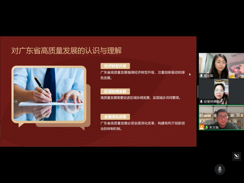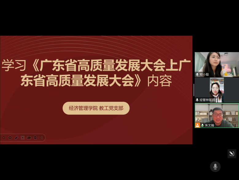 (通讯员:朱文翰)根据教工支部“2023-2024-2学期党史学习教育计划”的提议,教工党支部小组积极响应党史学习教育的号召,林郭韵、郑小聪、朱文翰三位同志于2024年3月9日通过线上形式开展了关于“学习《广东省高质量发展大会》内容”的会议,会议过程中,三位同志对黄坤明同志发表的《广东省高质量发展大会》中如何推动高质量发展进行了深入研讨与交流。