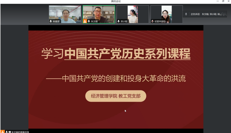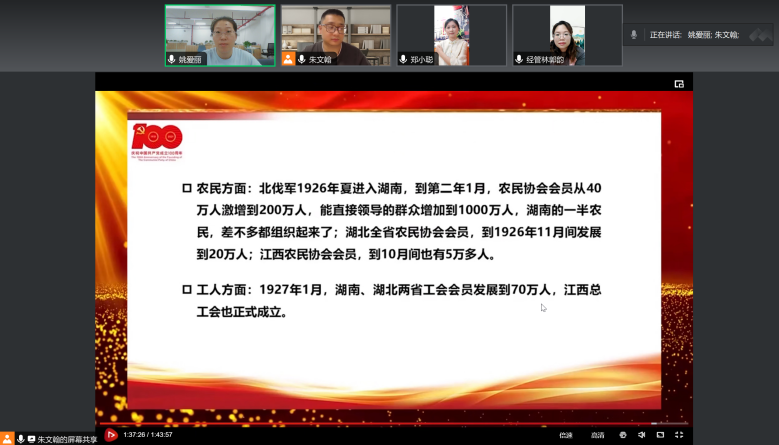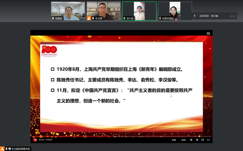(通讯员:朱文翰)根据教工支部“2023-2024-2学期党史学习教育计划”的提议,教工党支部小组积极响应党史学习教育的号召,林郭韵、郑小聪、姚爱丽、朱文翰等多位同志于2024年3月19日在线上开展了关于“学习《中国共产党历史系列课程—中国共产党的创建和投身大革命的洪流》内容”的会议,会议过程中,同志们对1921年到1927年之间我党的历史进行了深入的研讨,并按照(一)民族复兴呼唤新的政治力量(二)中国共产党的创建(三)投身大革命的洪流三个部分进行了系统的学习。在此次会议中,同志们通过深入讨论与交流,进一步加强了对中国共产党早期历史的认识,激发了大家学习党史的热情,并将这种热情转化为提升工作效率和生活质量的具体行动。
