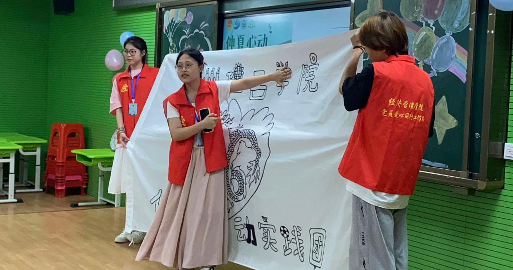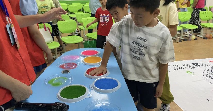 夏梦正长,山海逐浪。仲夏心动实践团成员邝芷晴向同学们介绍了仲夏心动实践团的队旗,在成员们的组织下,同学们为队旗添上了色彩,艳丽的小手印与夏日的碰撞让送教下乡、童心向学的火花在这一刻璀璨绽放!