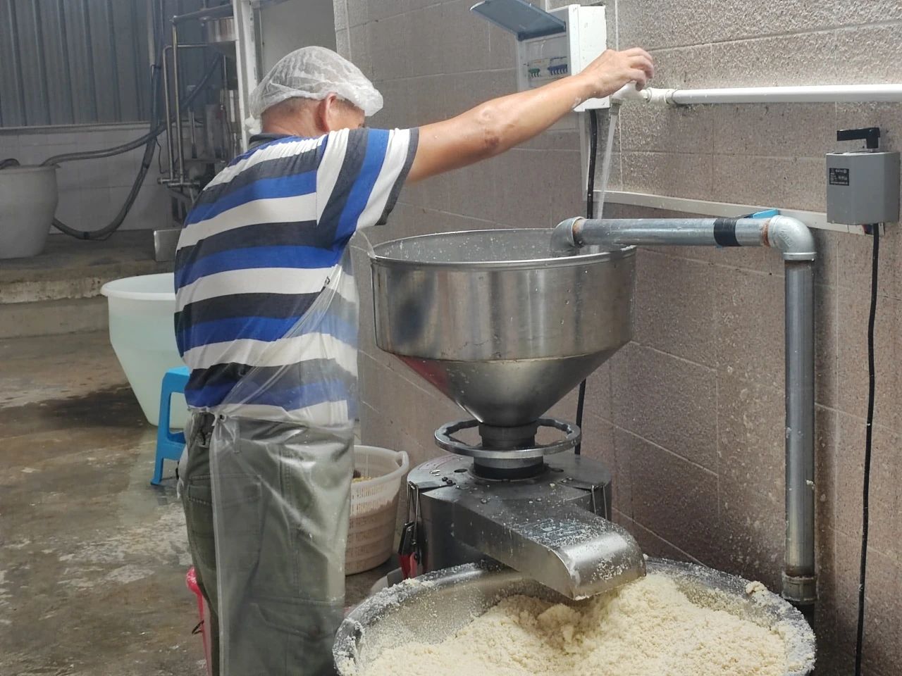 原料的精挑细选环节,每一颗大豆,都需历经严苛的筛选与审视才能脱颖而出。这些精选的大豆随后被细致清洗,以确保其符合食品安全标准。清洗过后,将大豆放入浸泡池中,根据大豆的品种的不同调整大豆浸泡时间的长短,确保大豆充分吸水膨胀。将浸泡好的黄豆送入机械磨浆设备中,在磨浆过程中严格控制加水量和研磨时间,以确保豆浆的细腻度和出浆率。依据水蒸气的原理,通过搅拌对豆浆进行导热,以确保豆腐在加工过程中达到所需的温度和熟度。在离心机与滤网的双重过滤下,豆渣与杂质彻底分离。