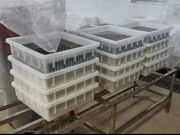 最后,在干净无菌的容器内,豆腐被精心切块、分装,利用豆腐按压机进行按压,排出豆腐中的多余水分,确保其自身紧实而有弹性的口感。随后,将豆腐从容器中取出,送入冷冻室低温保存。同时确保豆腐之间留有一定间隙,以便可以均匀受冷,确保品质与风味的长久锁鲜。