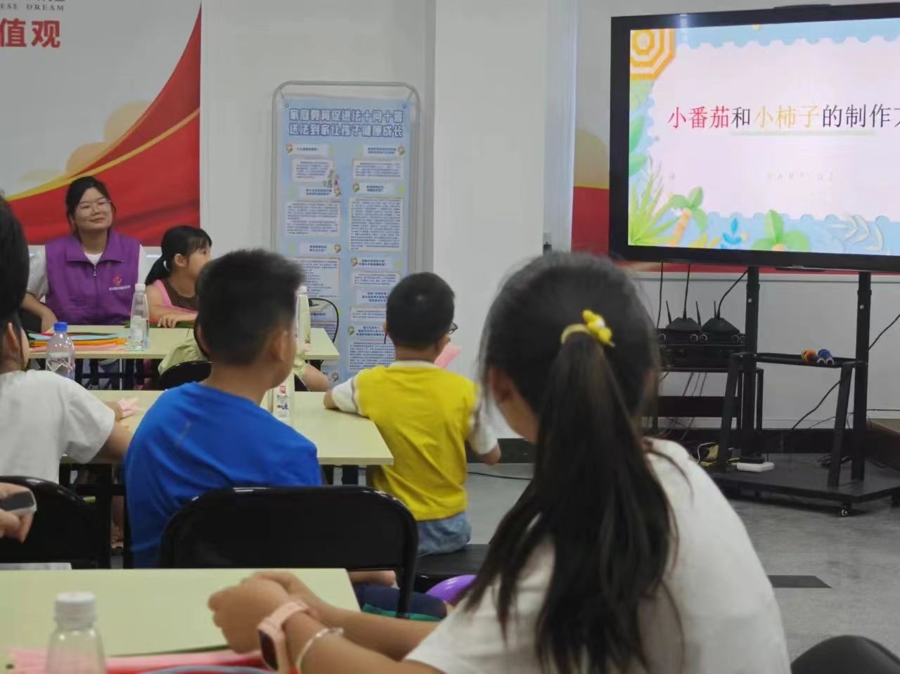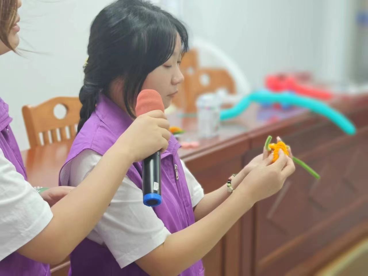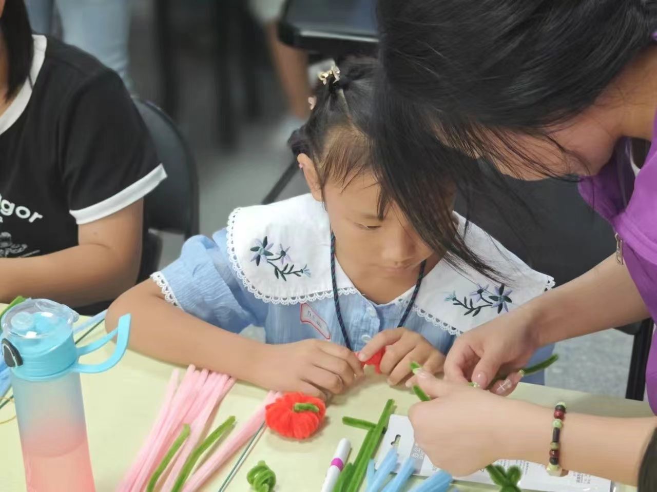 随着课程进度,大家开始动手制作自己的扭扭棒作品。在手工实践过程中,我们的团队成员都会在一旁进行协助与指导。课程主讲人施文先是进行了小柿子和小番茄的编织方法教学。小朋友们跟着做出来的一个个小作品,各个憨态可掬。随后,难度逐渐提升,教学了百合花的编织方法。一朵朵百合花在指尖绽放。每一次扭转、每一次编织,都凝聚着大家的智慧与创意。