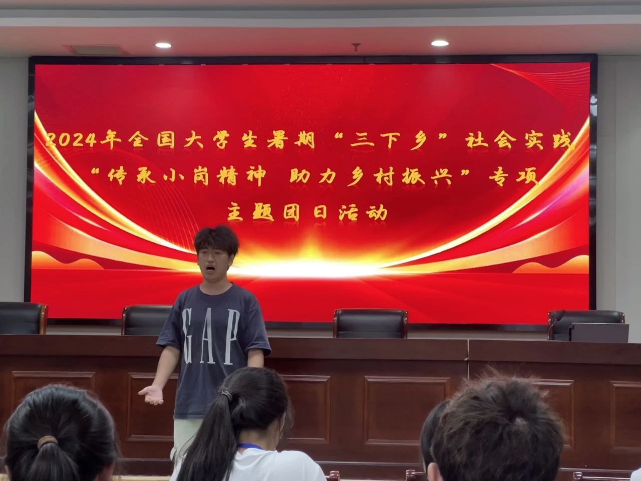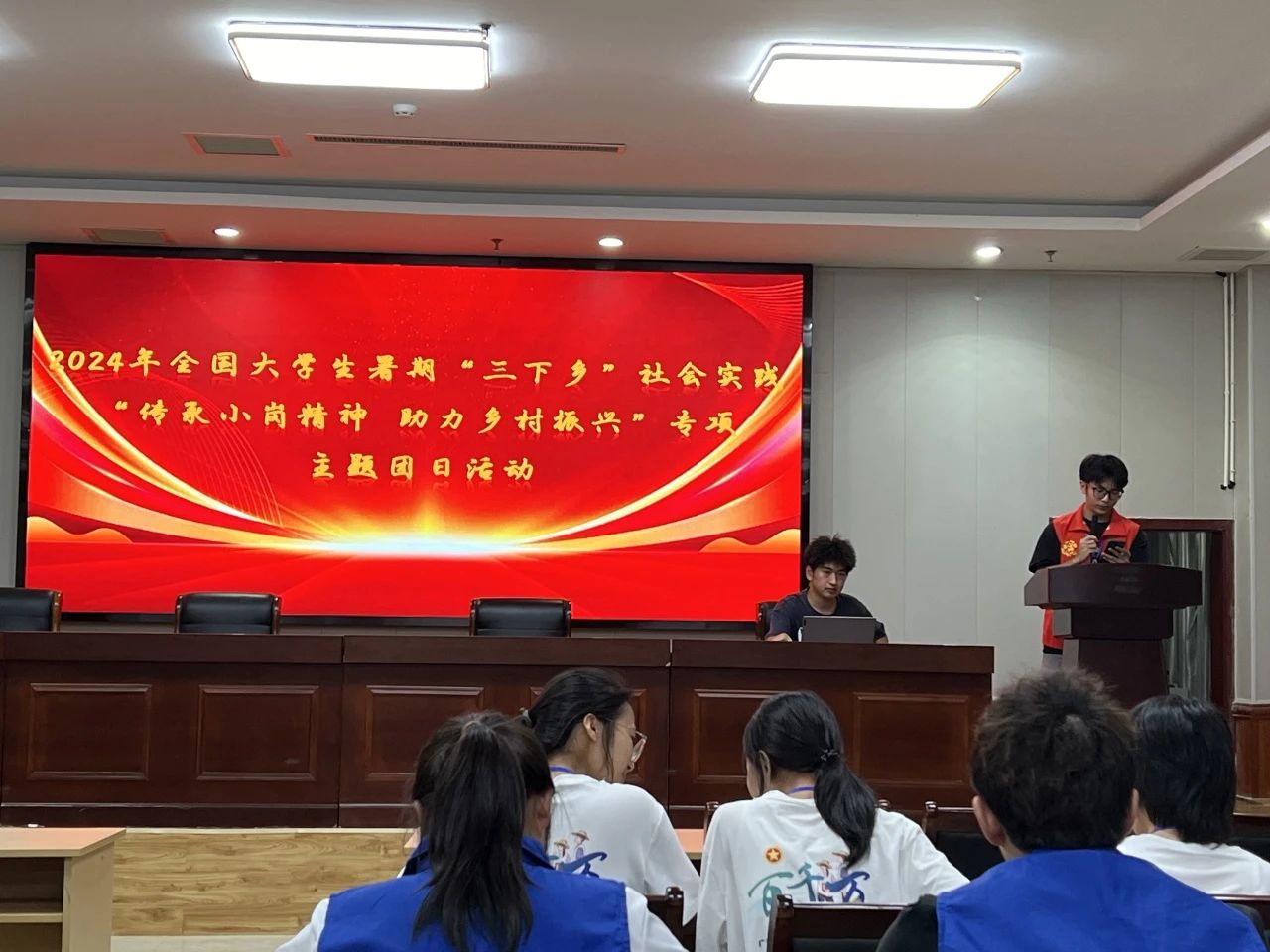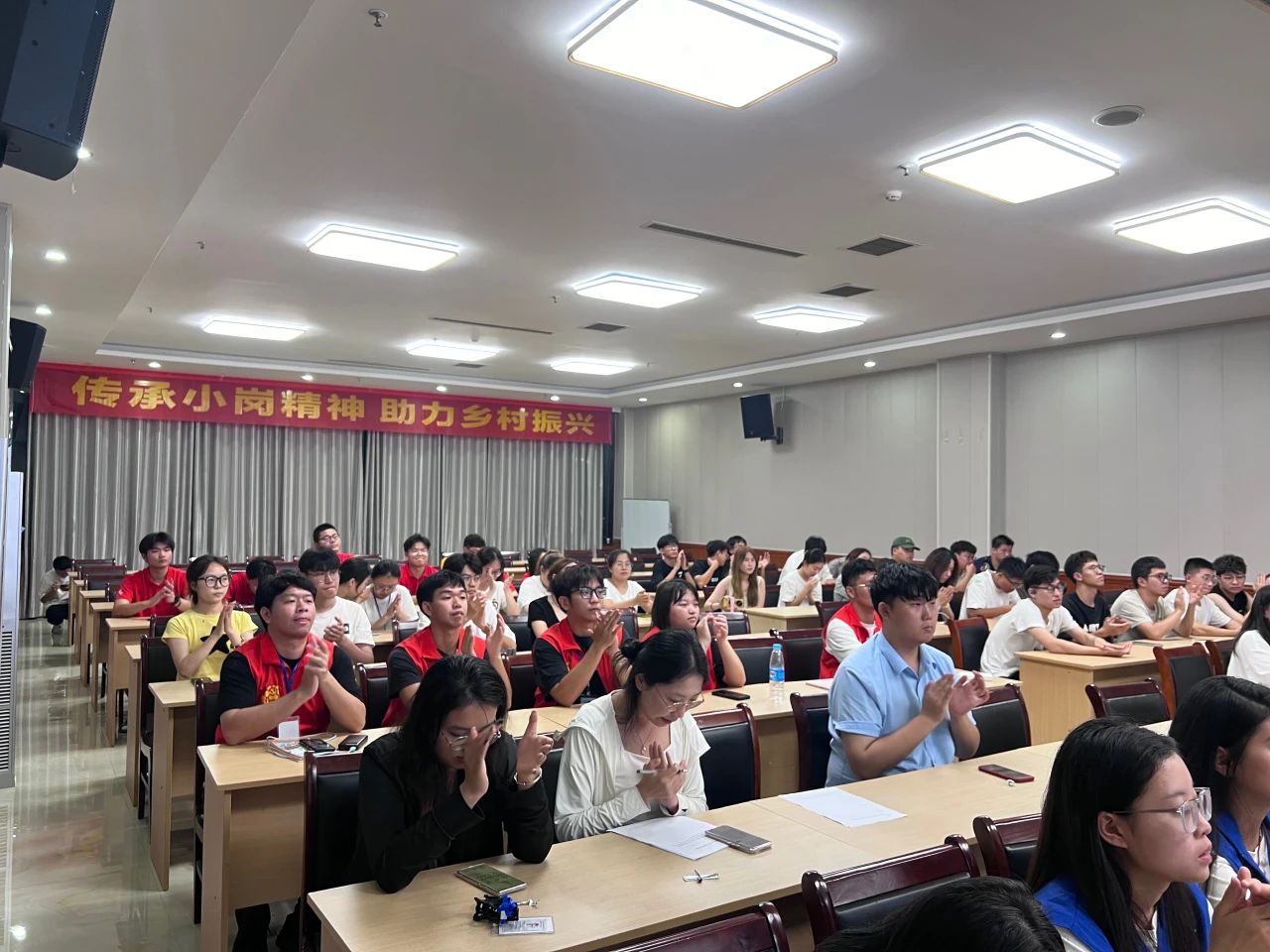 7月25日晚,2024年全国大学生暑期“三下乡”社会实践“传承小岗精神,助力乡村振兴”专项主题团日活动在小岗大酒店一号报告大厅展开。会上,二期专项四班组织委员作为主讲人献上自己作曲的《人民就是江山》作为开场。我队队员袁培译作为代表上台发言,发言内容包括本次社会实践的乡村振兴与乡村发展,并结合我校前段时间前往龙川县当地助力乡村振兴并取得良好成果的情况进行汇报,获得大家的一致好评。