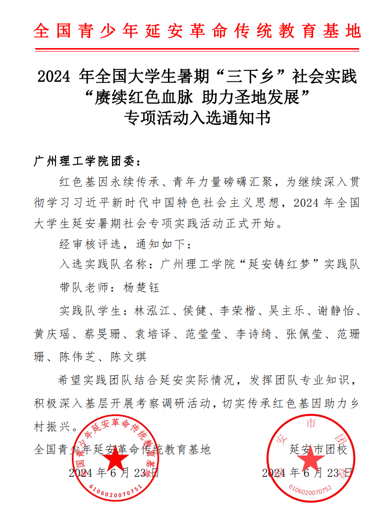 为贯彻落实习近平总书记关于青年工作的重要思想,引导广大青年奋进新征程、建功新时代,为全面现代化建设贡献青春力量,精准实现“校地合作、资源共享、双向受益”,建立地方与高校常态化合作交流机制。全国青少年延安革命传统教育基地(延安市团校)决定在暑期组织开展“赓续红色血脉,助力圣地发展”2024年全国大学生延安暑期社会实践专项活动。我校响应团中央号召,由学校团委牵头,积极组织学生干部申报本次专项活动,经过层层选拔,广州理工学院“延安铸红梦”实践队成功入选本次全国大学生延安暑期社会实践专项活动,取得入选通知书,活动时间为延安专项第五期。
