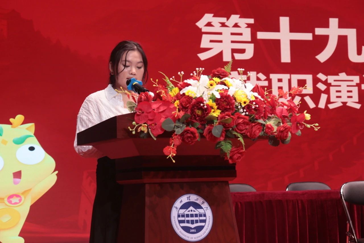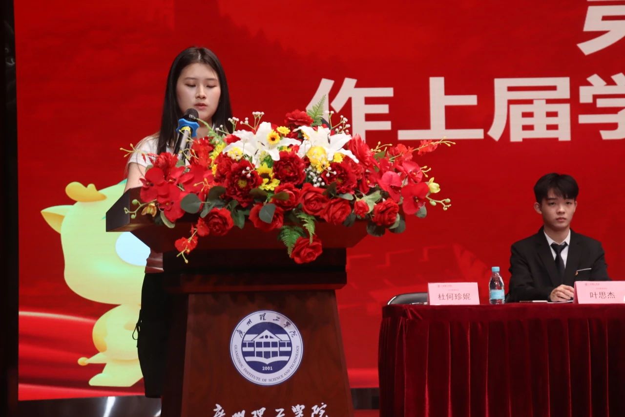 第十三项议程为第五届执行主席兼团总支副书记李玉玲上台做就职演讲。首先,她对一路给予她支持的书记、辅导员老师和任课老师以及学生会的师兄师姐们表达了感激之情,并承诺会以百分百的热情扛起重任,带领新一届学生会全体成员克服困难,迎接各项挑战。随后,她代表新一届学生会成员为大家介绍了本学年的工作设想。最后,她希望我们能做明晰肩头重担、不负时代使命的接班人。