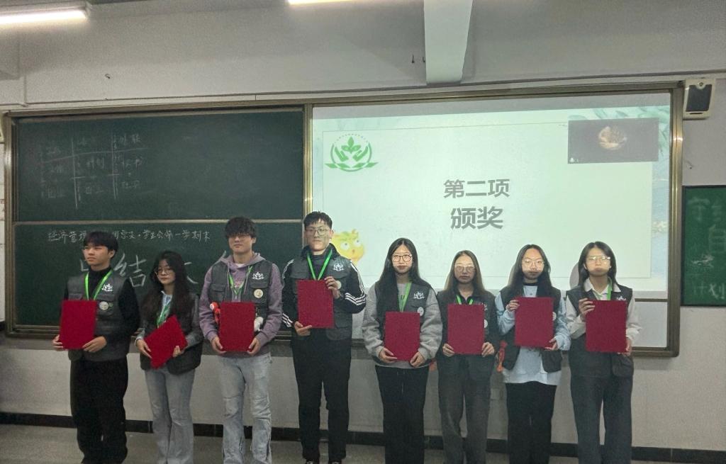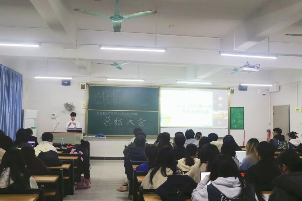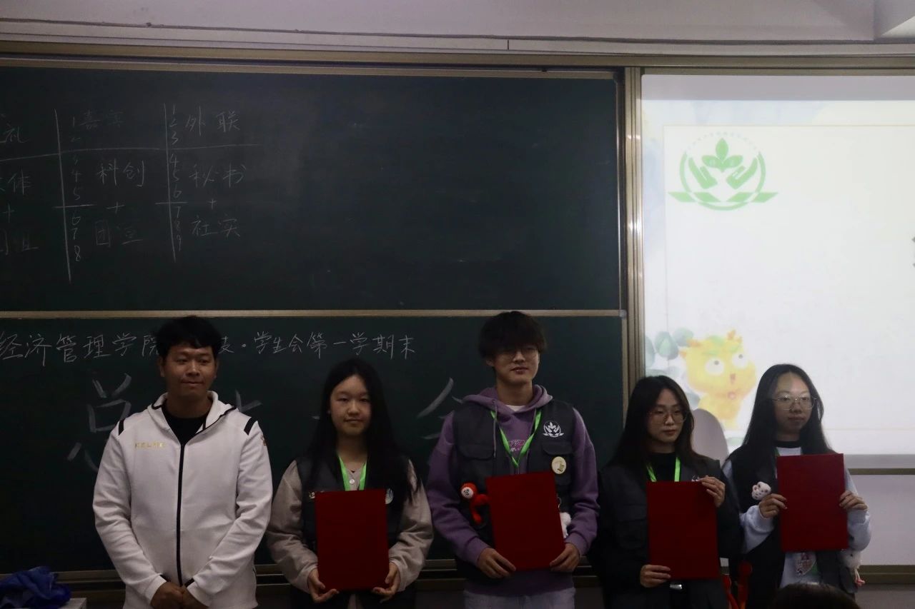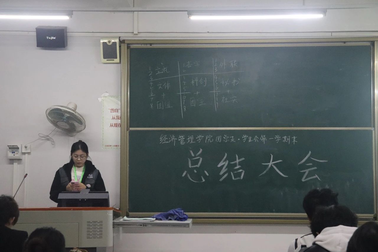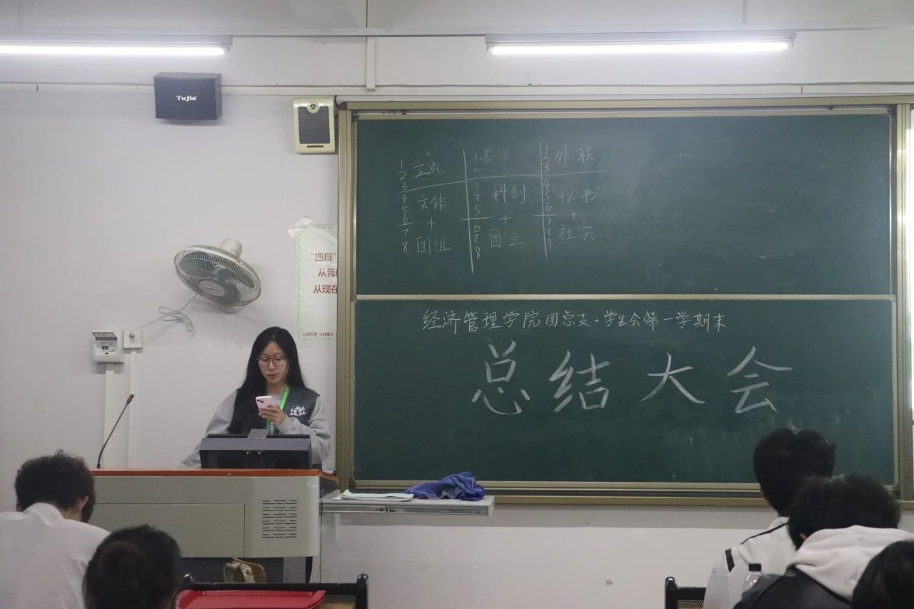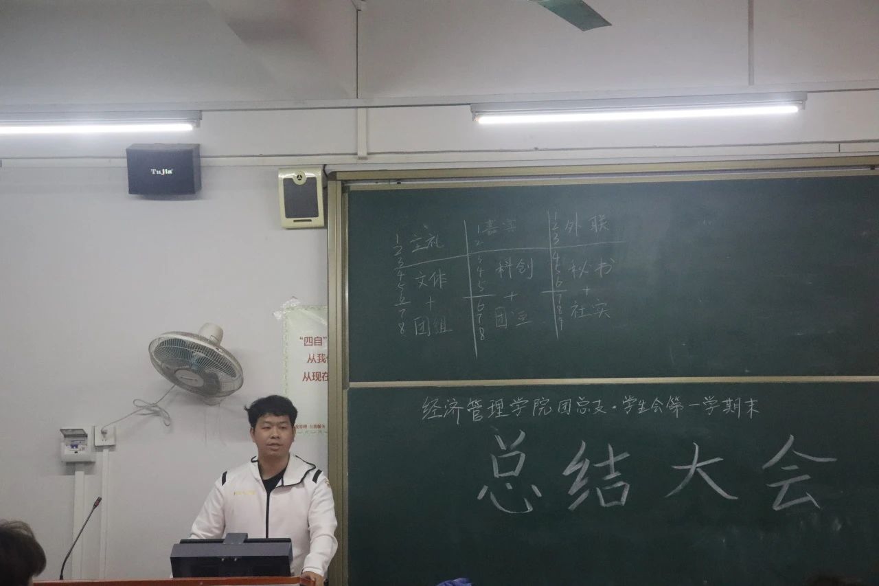 第五环节,团总支·学生会的三位执行主席对本学期的团学工作进行了总结。主席团总结了团学在本学期里遇到的挑战和困难,并且对部门一些活动的策划及其成果表示肯定和对在学院组织的各项活动中积极工作、辛苦付出的团学成员表示由衷地感谢。最后,他们希望每位成员在未来中都能够展现出更大的勇气和创造力,不畏惧挑战,勇于承担责任,以开放的心态拥抱新思想,以实际行动推动创新,共同为团学工作注入新的活力和动力。