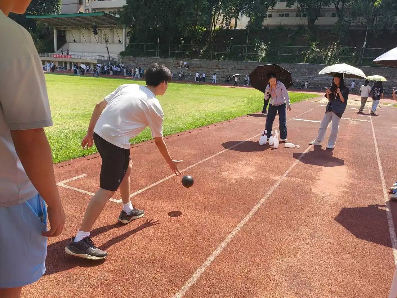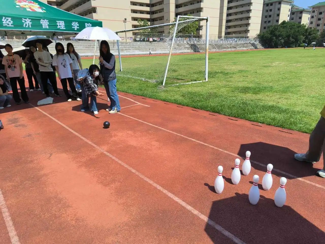 本届趣味运动会设置了“毛毛虫竞赛”“两人三足”“传递呼啦圈”“保龄球”四种项目。活动现场,同学们热情高涨,踊跃参与,配合默契。