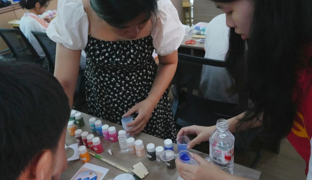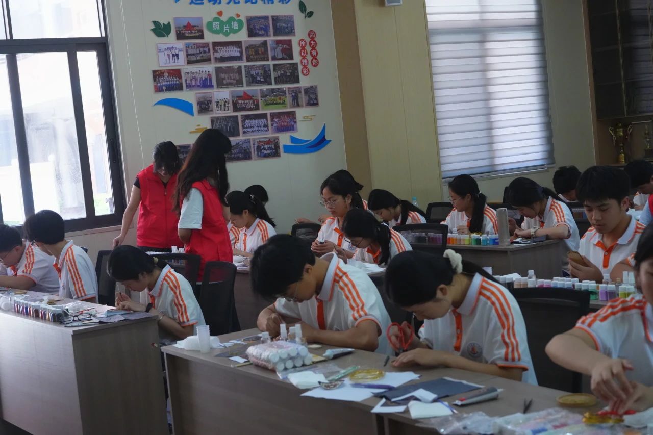 课堂上,大部分同学已进展到调沙、点蓝的关键环节。他们一丝不苟地先用清水将沙子反复洗涤,直至无浮沫残留,随后精准地将胶水加入沙中,最后小心翼翼地运用滴管将混合物填充到作品的空隙之中。龙川一中的同学们对此次课堂表现出极其浓厚的兴趣。他们全神贯注地对待自己的作品,每一个细节都精心雕琢。制作出的作品令人赞叹,不仅工艺精巧,而且颜色搭配和谐美观。