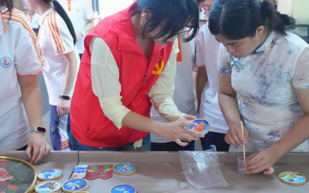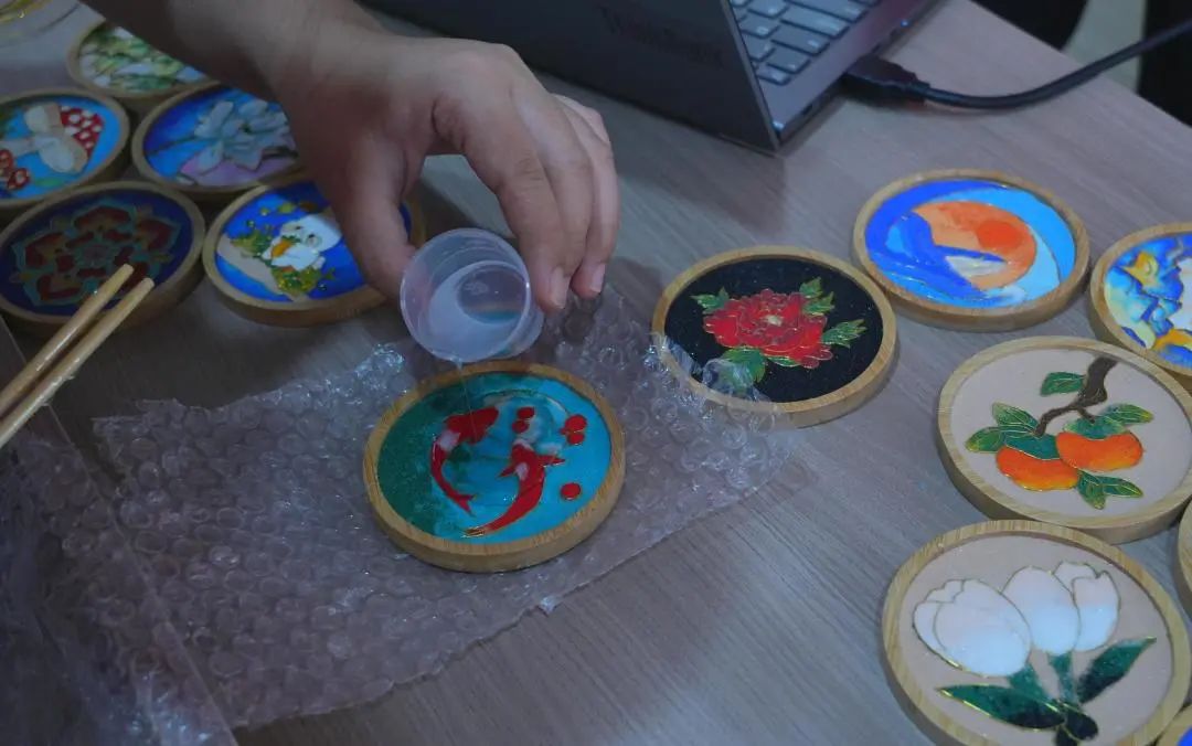 课堂现场气氛热烈,极限挑战突击队队员与同学们、老师们齐心协力,将未完成的掐丝珐琅作品进行最后一步——封胶。在大家的共同努力下,一件件精美的掐丝珐琅作品逐渐呈现,闪耀着独特的光芒。