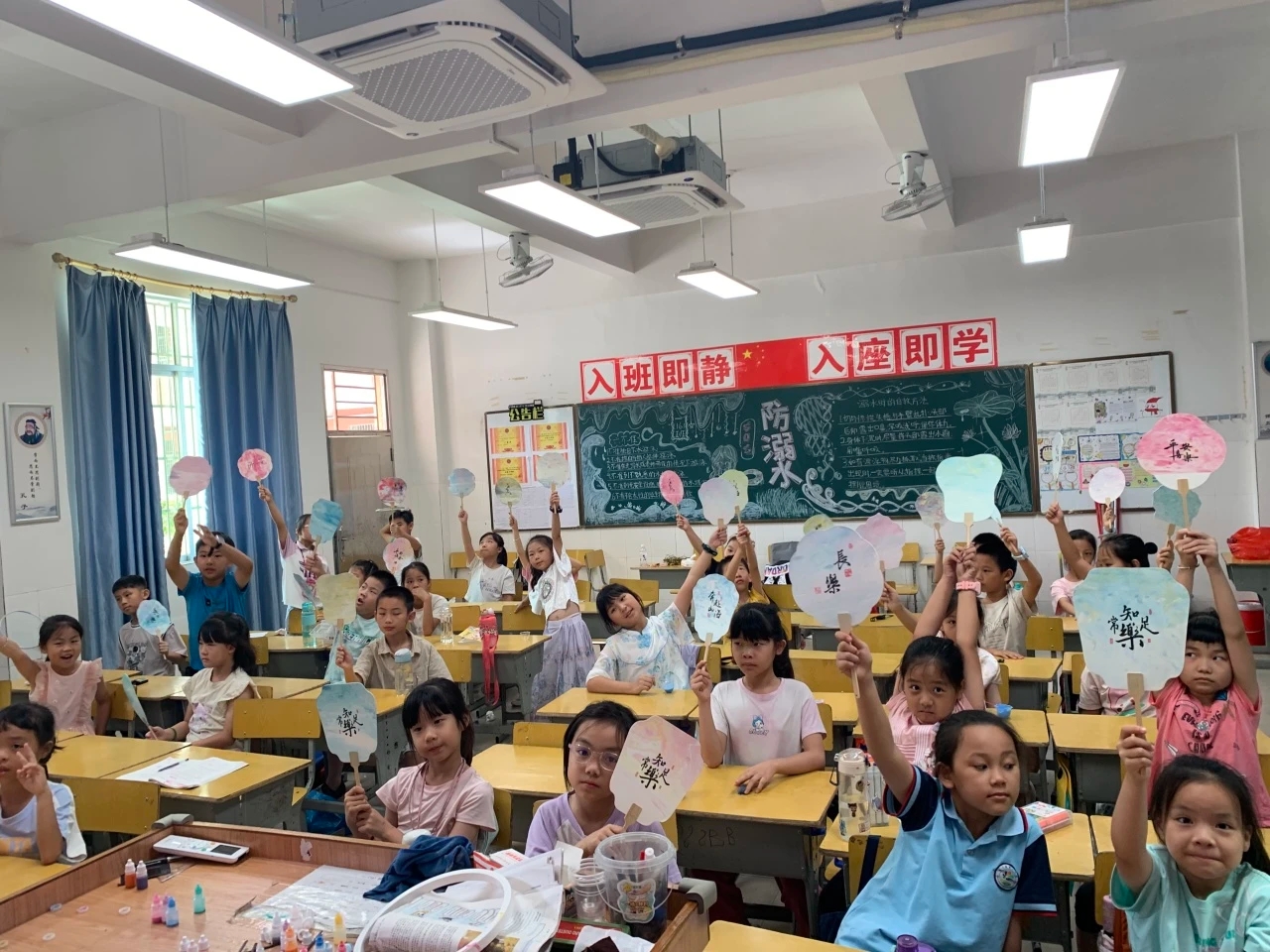 队员简要介绍漆扇的概念、起源与技艺后,通过视频重点讲解制作流程、飘漆技法和配色要点。学生有序完成漆扇制作并进行装饰。这堂课既培养了学生对传统工艺的审美与观察能力,也提升了他们的动手与创新能力。