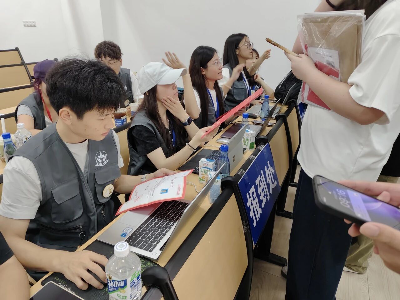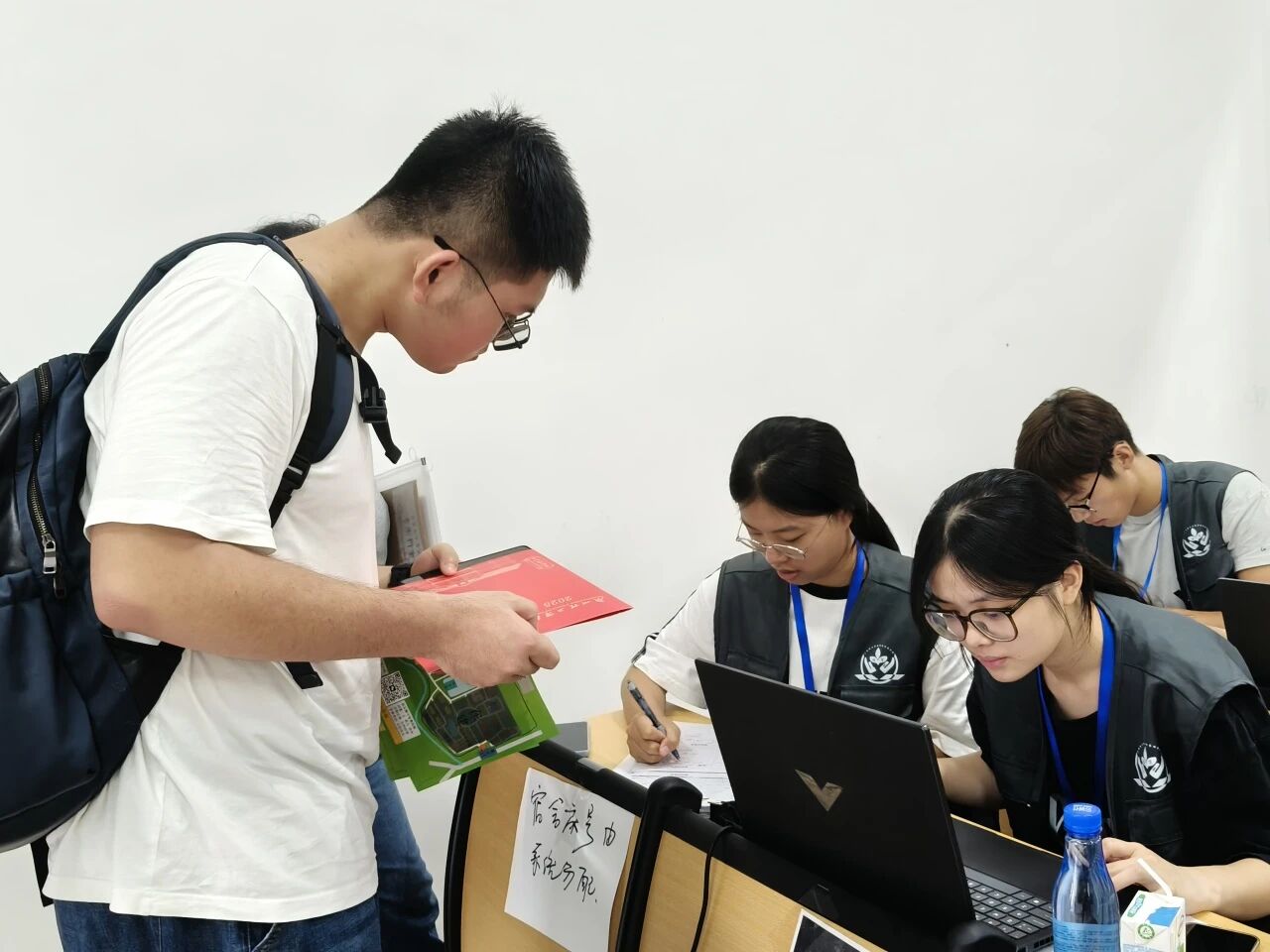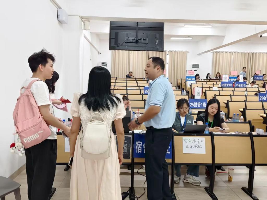 迎新志愿者们佩戴着专属工作牌,化身“活导航”分散在校园各个角落,主动上前对接每一位新生:从引导至报道点核验身份、协助填写信息,到帮忙拎起行李、指引前往宿舍区域,全程脚步不停、耐心十足。一句主动的搭话、一次细致的引路,都让刚刚离家的新生们感受到了学院大家庭的温暖与关怀。