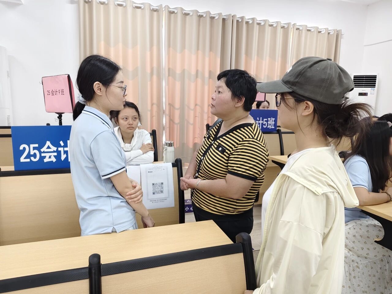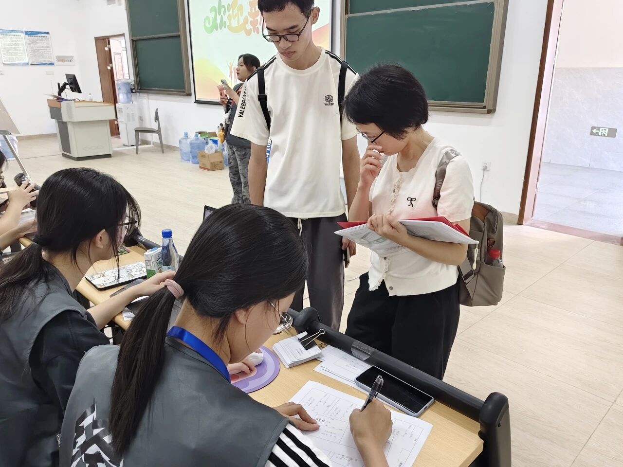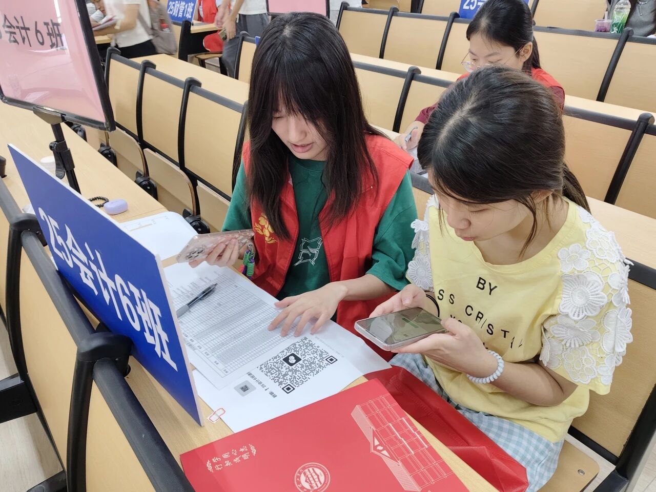 迎新志愿者们佩戴着专属工作牌,化身“活导航”分散在校园各个角落,主动上前对接每一位新生:从引导至报道点核验身份、协助填写信息,到帮忙拎起行李、指引前往宿舍区域,全程脚步不停、耐心十足。一句主动的搭话、一次细致的引路,都让刚刚离家的新生们感受到了学院大家庭的温暖与关怀。