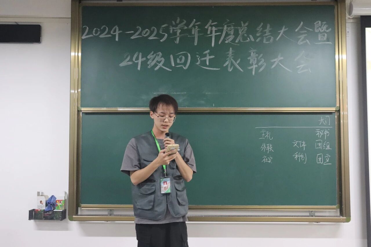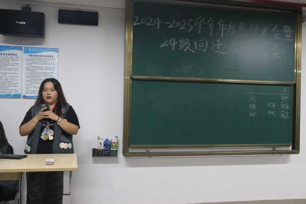 团总支书记杨楚钰提出了团学的变动,将对外联络部收编到主持礼仪队并更名为公关部,强调了社会实践部的“三下乡”项目和新增的志愿者工作的重要性,鼓励大家敢于创新、勇于实践,打破常规,探索新的工作领域和模式。他希望各部门之间要加强团队凝聚力,以团队发展带动个人发展,同时也强调了在团学工作中坚持正确方向的重要性,以及在新的背景下,如何更好地服务学生、服务社会。聚是一团火,散是满天星始终是我们团学不忘初心、牢记使命的理念。