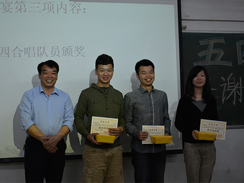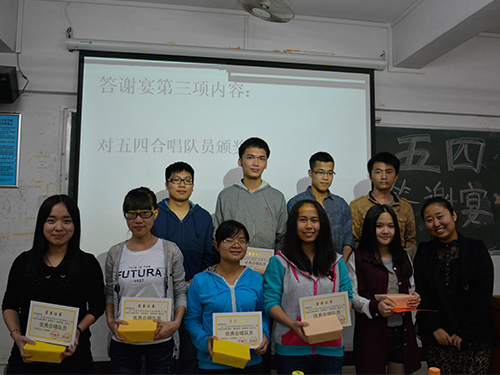 会上对在大合唱中表现优秀的指挥庄钰梓同学颁发了“最佳指挥奖”、陈梦儿等同学获得“最佳笑容奖”,郑文辉等同学则获得“优秀合唱队员奖”。会议在同学们在欢乐的游戏中结束。