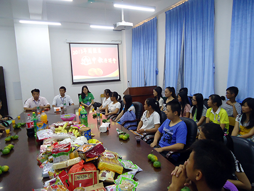 丹桂飘香,值此中秋佳节,我系邀请大一各班代表在我系会议室召开2013中秋慰问座谈会,我系党总书记李伟民、办公室主任刘亮到场对同学们表示问候。