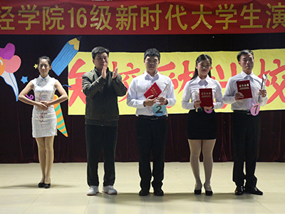 谭俊强书记为赢得最佳台风奖的16会计3班赖梓莹和获得最佳人气奖的16经济1班林泽润颁发相应奖状。