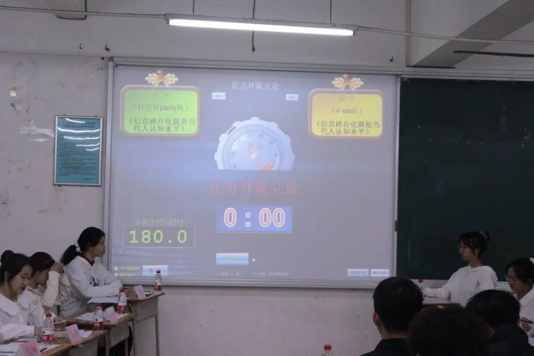 接着大赛进行到驳论环节。正方三辩讲述了信息化碎片时代不仅会给我们提供信息资源的渠道、整合信息资源的能力,还会提升我们运用信息资源的技能、提高对不完整信息的认知度。随后由反方三辩陈述,她讲到在信息化碎片时代,编排逻辑性的重要,同时,她认为随着时代的迁移发展,当代人忽略了生产过程的条件,又用论据论证信息化碎片时代会降低人的认知水平。