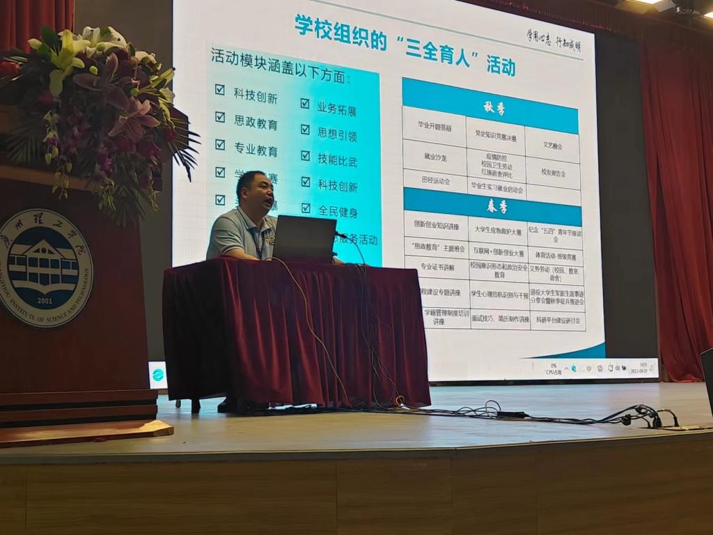 院长谢林林和党总支书记彭康煜为新生们介绍了校园学习生活环境以及未来职业发展规划,展示了校园风光,让同学们对学校有更多的了解。院长书记也为同学们介绍了校园组织的“三全育人”活动等,讲话的最后,书记进行了安全教育以及防诈骗宣传。
