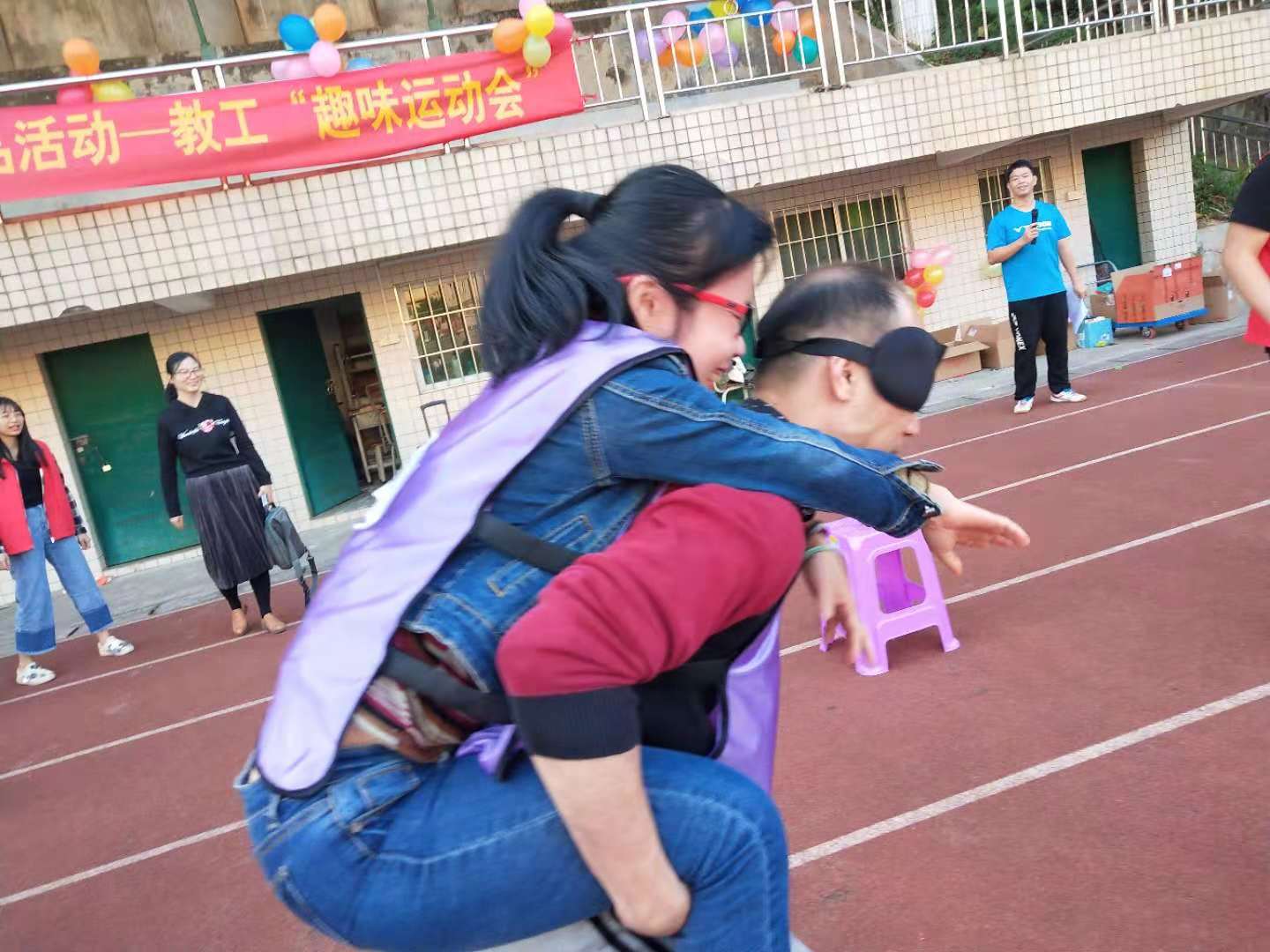 活动由杨楚钰老师主持。整个活动分为三个环节,一是“瞎子背瘸子”,二是背靠背运气球,三是踩气球。活动开始之前,先由主持人讲解游戏规则,工作人员现场示范,再由各分组队员进行比赛。比赛过程中,各组教职工积极投入,全力拼搏,充分展现了团队的“合作竞争,激情奉献”的运动精神。
