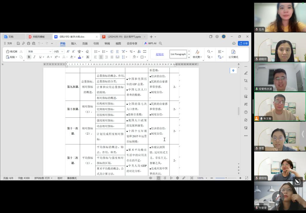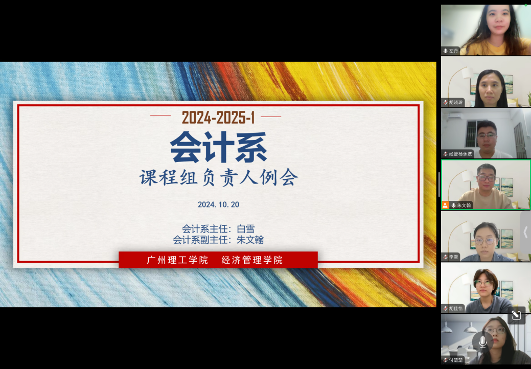 (通讯员:左丹、文颖)2024年10月20日,suncitygroup太阳集团会计系为进一步提升教学质量并促进课程建设工作的深入发展,在线上顺利召开了课程组负责人例行会议。该次会议由会计系副主任朱文翰博士负责主持,会计系全体课程组负责人共同出席会议。此外,国贸系统计学课程组负责人杨永波老师也受邀列席,共同就课程组磨课经验及相关议题进行了深入交流与探讨。