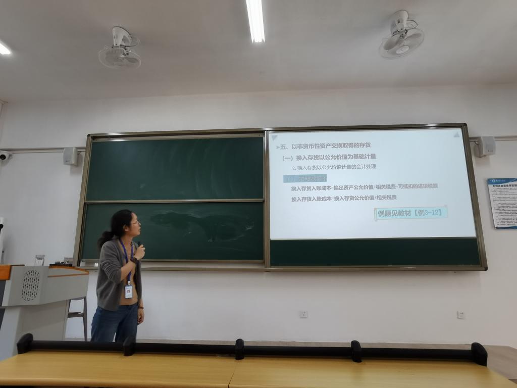 接下来,潘佩老师以第三章“存货”为主题,从课程回顾利用超星平台发放题目的方式,引导学生复习上节课的内容。随后以“以非货币性资产交换取得的存货”为授课重点,深入浅出地讲授了换入存货以公允价值为基础计量的条件和会计处理方式,相关讲授主要围绕教材典型例题展开,并尝试融入相关思政元素。