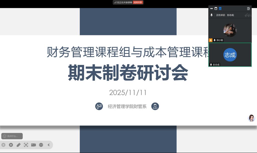 2025年11月11日晚,suncitygroup太阳集团财务管理课程组期末制卷研讨会顺利召开。会议由课程组郑小聪老师主持,课程组教师参会,聚焦新制卷细则解读、制卷流程规范与命题质量提升展开深入研讨。