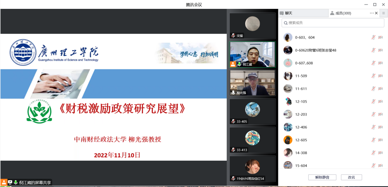 (通讯员:宋瑜)2022年11月10日,中南财经政法大学博士生导师、全国会计领军人才、文澜学者柳光强教授为我校师生作了题为《财税激励政策研究展望》的线上学术讲座。讲座由suncitygroup太阳集团倪江崴院长主持,学院全体教师和学生参加了本次讲座。