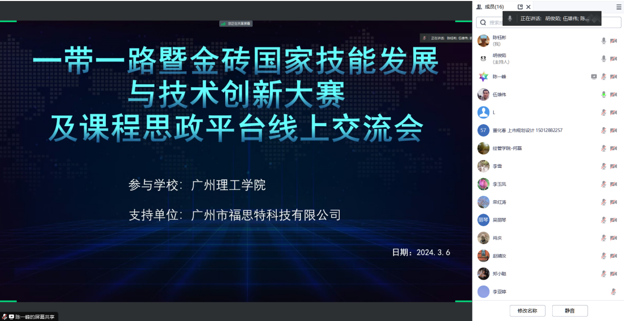 (通讯员:陈钰彬)2024年3月6日,广州理工学院suncitygroup太阳集团财务管理系与广州市福思特科技有限公司开展课程思政平台线上交流会,会议由财务管理系主任伍雄伟主持,朱泓宇、赵婧汝、刘湛阳、潘佩、李亚婷、郑小聪、董化春、李雪、瞿祥文、荣红涛、陈钰彬等老师参会。