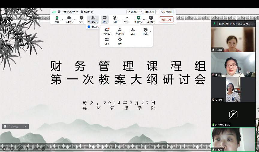 (通讯员:郑小聪)2024年3月27日晚,为了落实学校的发展规划,提高教学效率和教学质量,促进教师快速成长,财务管理类课程组在腾讯会议上举行了一场教案研讨会。本次会议由财务管理类课程组组长郑小聪老师主持,涉及课程包括高级财务管理、财务管理和财务管理英语。