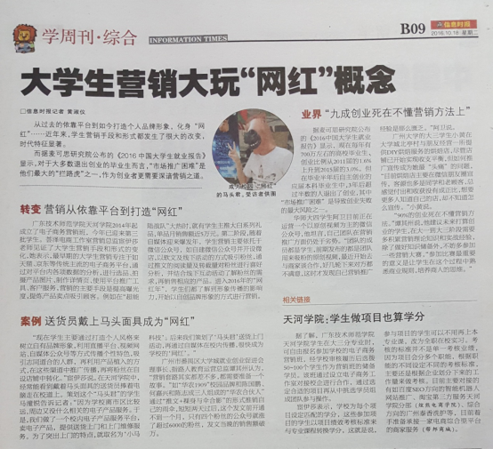 10月16日记者黄淑仪对我院电商工作室进行采访,并将我院新颖的教学方式及教学成果刊登报道在信息时报的学周刊上,文中讲述了我院从2014年首次创办电商实验班至今的改革历程,电商班学生校内创业的经典案例,以及我院对创新创业的大力支持,并且不断改善校园创业环境;业界对学生创业的忧虑主要还是基于对营销方法上的欠缺,在校期间应多参与企业项目实习历练,将书本学习的营销知识运用到实际工作中去。