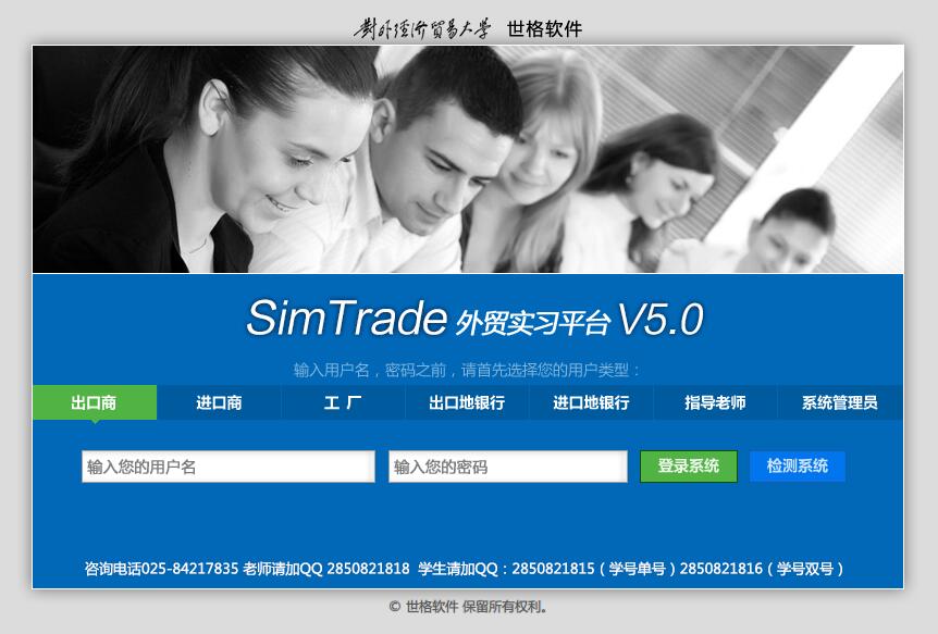 主要功能:SimTrade外贸实习平台定位于外贸相关专业的教学练习、认识实习和专业实习,通过归纳总结整个外贸行业的流程和惯例,在互联网上建立几近真实的国际贸易虚拟环境,让学生在其中亲身体验国际贸易的风险和乐趣。SimTrade外贸实习平台融合了国际经济学、电子商务理论和外贸实务流程,很好地模拟了当今国际商务的真实环境。每个参与SimTrade外贸实习平台虚拟贸易的学生都将按照实习计划扮演进出口业务流程中的不同当事人,从而共同组成了模拟贸易环境。通过这样相互竞争和协作的角色扮演,他们将面对出口商、进口商、供应商甚至银行的日常工作,从而熟练掌握各种业务技巧,体会客户、供应商、银行和政府机构的互动关系,真正了解到国际贸易的物流、资金流和业务流的运作方式,最终达到在“实践中学习”的目的。