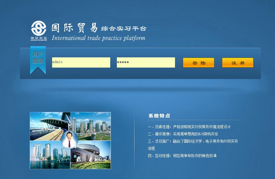 主要功能:综合实习平台为学生提供国际贸易全程仿真的实验和实习环境,软件将外贸交易过程中涉及的外经贸局、银行、保险公司、出入境检验检疫局、海关、外汇管理局和外运公司等多个角色进行了很好的体现。学生在软件中可仿真模拟进、出口公司进行国际贸易交易,贸易磋商、签订合同、进出口许可证申请、产地证明、审证改证、开具商业发票、货物托运、商品投保、报关、报验、制单结汇、审单付汇、业务善后、发送单证等环节,可得到充分的锻炼和运用。