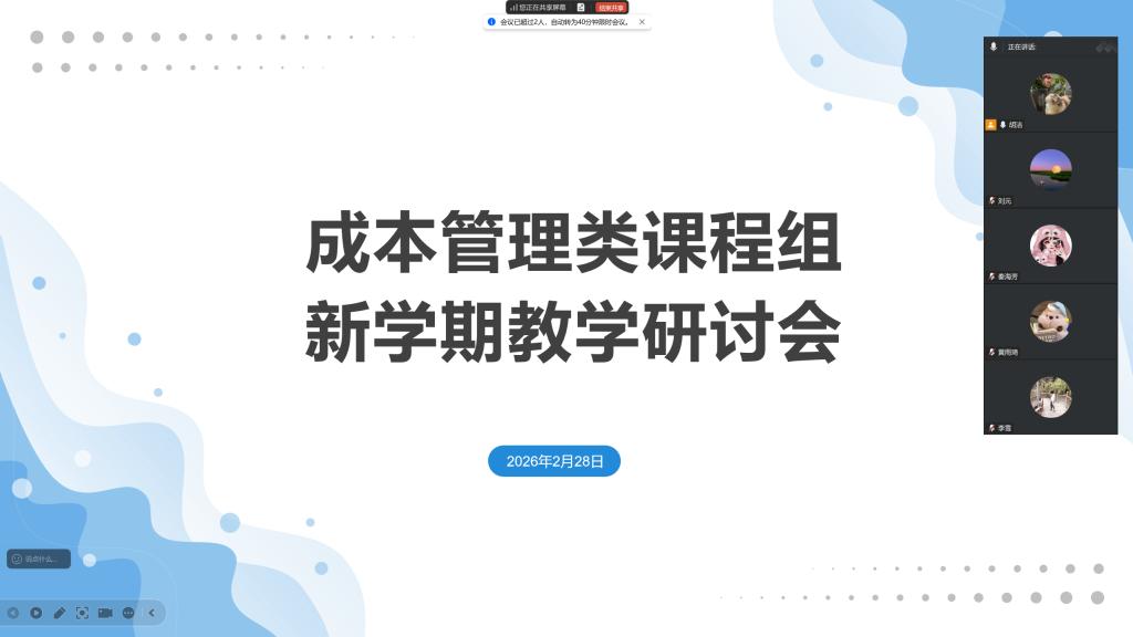 为确保新学期成本管理类课程教学工作有序、高质量开展,2026年2月28日,成本管理类课程组召开了线上期初教学研讨会议。会议由课程组负责人胡洁主持,全体课程组教师参加了会议。