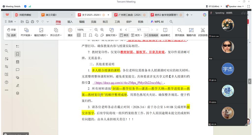 会议重点部署了新学期教学材料规范收集与上传工作。根据学校教务处及学院教学管理要求,全体任课教师须严格通过学校教学材料资源平台,完成2025-2026学年两学期相关课程教学大纲、教案及课件的上传归档工作。同时,为规范教学管理,完善教学业务档案建设,教师需在开学第一周内完成2025-2026学年第一学期个人业务档案更新工作。会议着重强调,所有教学材料须严格遵循统一命名规范,确保格式标准、内容完整。