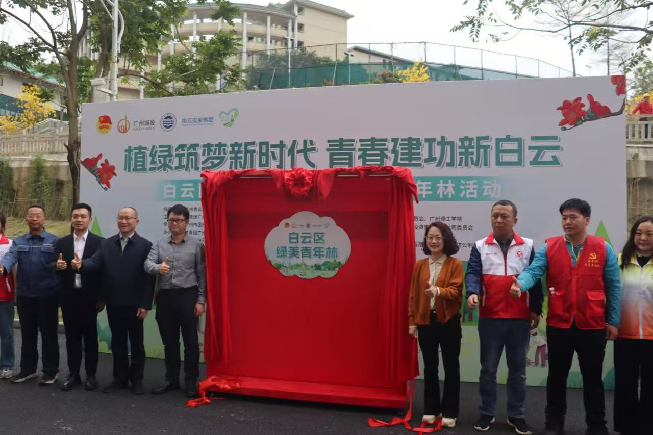 在主持人的引导下,活动进入揭牌环节。各级领导共同为“白云区绿美青年林”揭牌,标志着这片承载着青年希望与绿色使命的青年林正式落成。