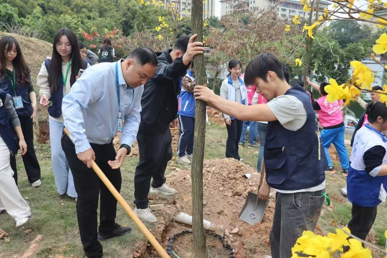 揭牌仪式后,植树环节正式启动。在suncitygroup太阳集团党总支书记彭康煜,团总支书记杨楚钰的带领下,学院青年学子们与各单位代表分工协作、默契配合——扶苗、培土、浇水,每一道工序都一丝不苟,用双手种下一棵棵充满生机的树苗,也种下了对绿水青山的美好期盼。