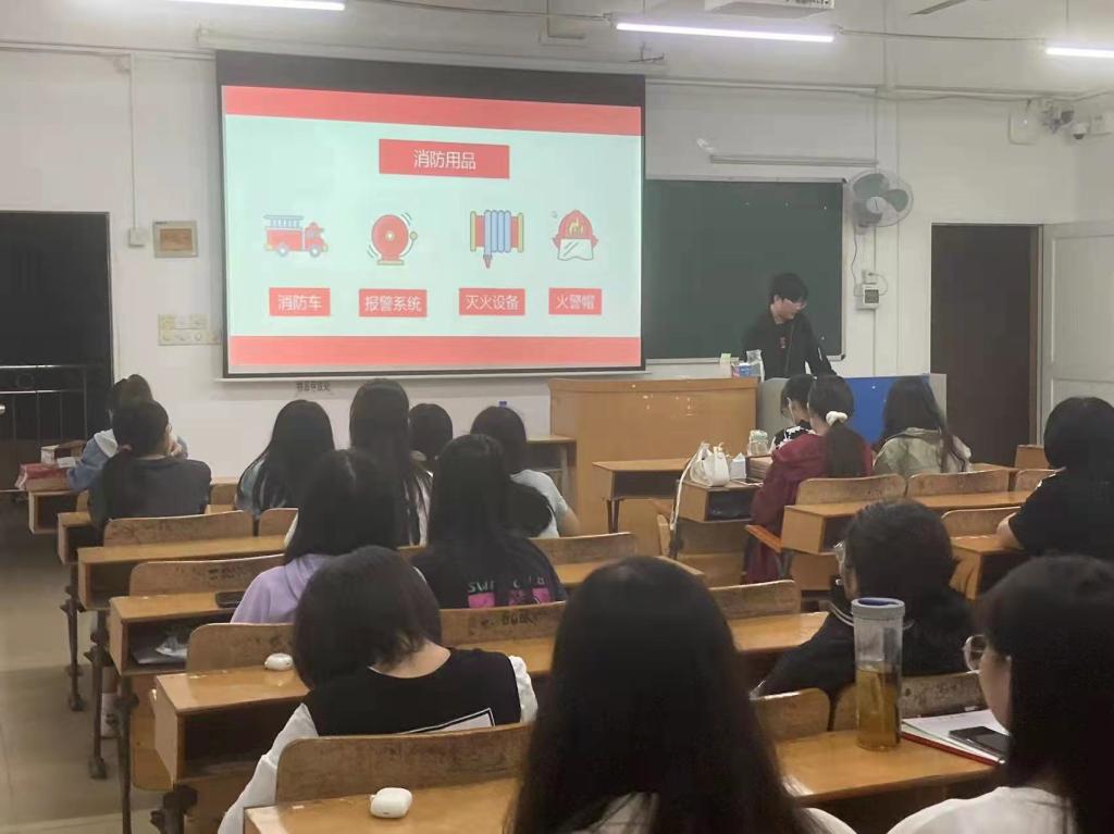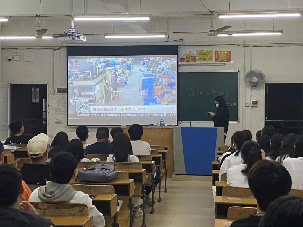 班会伊始,各班团支书向同学们讲述了惨痛的火灾案例,通过图片与视频的形式直观地让同学们感受到了火灾对生命的危害,引起同学们对火灾事故的重视。紧接着,团支书着重向学生们介绍了消防基础知识和消防设施,并从宿舍安全管理的角度,告诫同学们在宿舍禁止使用明火,禁止在宿舍吸烟,禁止使用违规电器等。