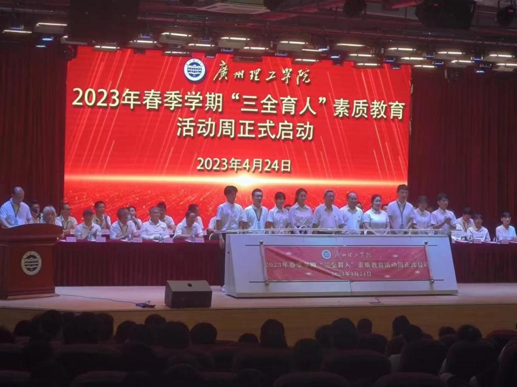 最后,校长胡社军、党委书记黄圣诚与8位师生代表共同启动了广州理工学院2023年春季学期“三全育人”素质教育活动周。