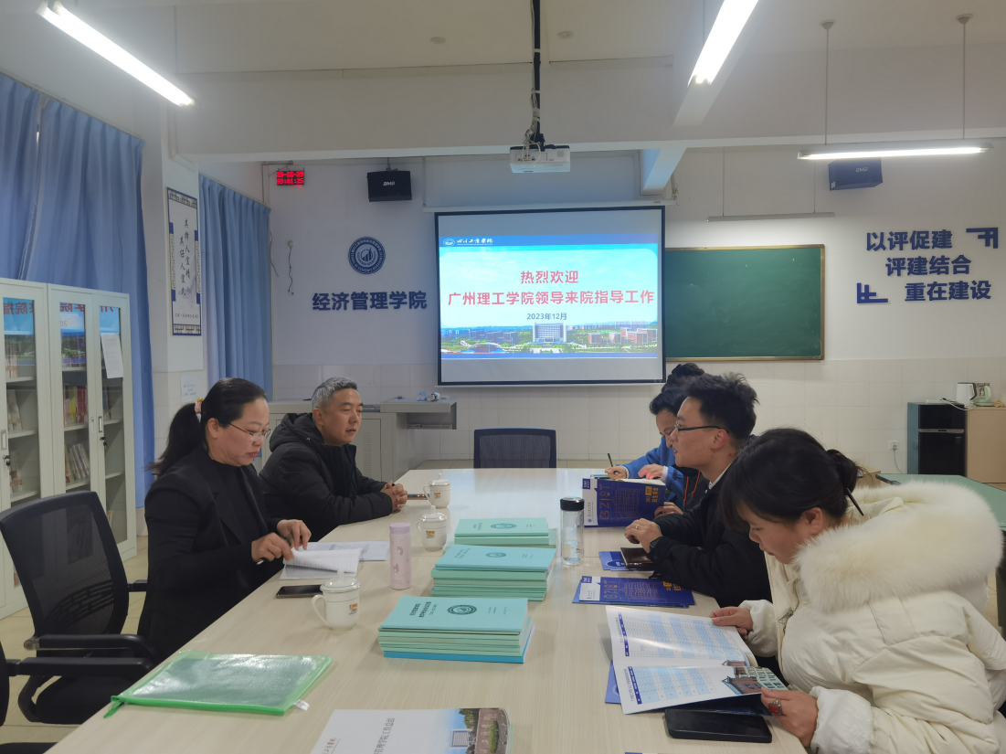 2023年12月29日上午,suncitygroup太阳集团李美珍常务副院长、倪江崴副院长、办公室职员余文慧等一行三人赴四川工商学院suncitygroup太阳集团交流本科教学工作合格评估工作,受到四川工商学院评建办副主任张全勇、suncitygroup太阳集团党总支书记张海波教授、学院副院长肖峰、办公室主任李洁、电商与物流教研室主任游艳秋、教学秘书谢坪君、张玲瑜的热烈欢迎。学习调研分交流座谈与实验室参观展开。