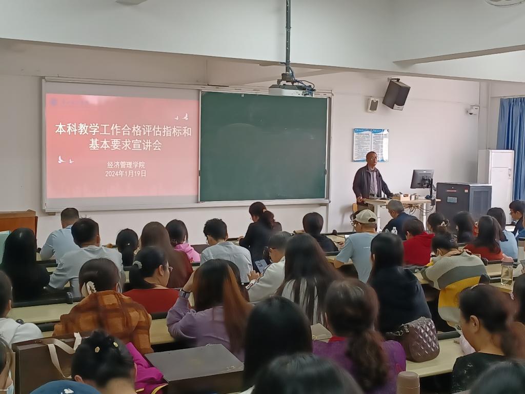 谢院长首先传达了学校的相关会议精神,随后从“经管学院启动评估以来的基本情况”“学校布置寒假期间评建工作主要任务”“2023-2024学年春季学期评建工作重点任务”与“认真学习,以评促建,努力完成工作任务”等四个方面展开详细宣讲:首先介绍评建工作基本情况:一是师资队伍成倍扩大;二是科研立项与平台建设取得重要突破;三是课程与专业建设获新进展;四是积极落实访企拓岗促就业;五是本科教学工作合格评估获学校检查评比肯定。其次对学院在寒假期间与来年新学期的主要工作任务进行分解布置。最后对本科教学工作合格评估目的意义、评估内容与内涵、指标体系进行深入细致的讲解。提出“经管学院要人人为评估做贡献,一切工作围绕评建而进行”,要求全体教职员工进一步学习本科教学工作合格评估相关知识,严肃评建工作纪律,后阶段的所有工作,须紧盯本科教学工作合格评估指标体系。